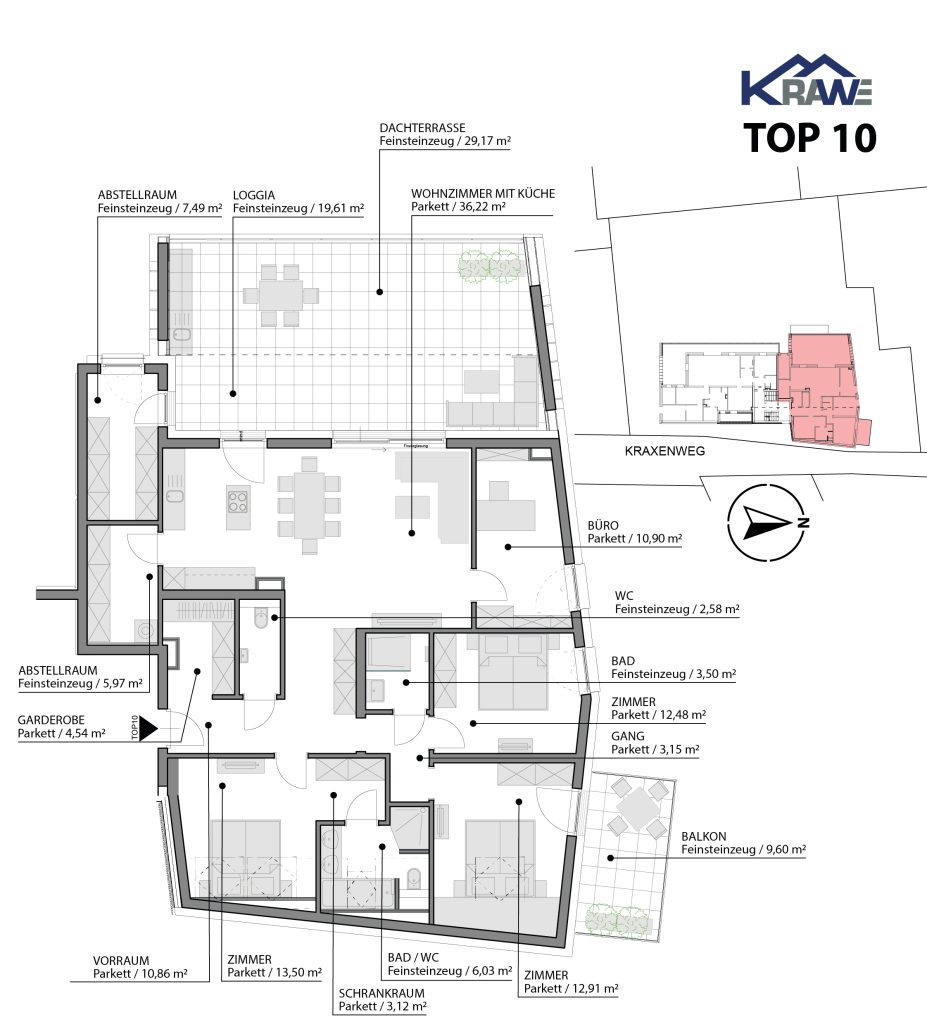Disclaimer/Haftungsausschluss: Diese Unterlage ist eine allgemeine Information des Projekts, die keine Vertragsgrundlage bildet. Dargestellte Grundrisse und Ansichten beruhen auf Daten, die den aktuellen Entwurfsstand bei Drucklegung repräsentieren, welche im Zuge weiterer Planungsphasen variieren können. Alle gezeigten Ansichten des Gebäudes sowie der Einrichtung sind Symbolbilder und freie künstlerische Darstellungen. Für die Richtigkeit, Vollständigkeit und Aktualität der Bilder und Inhalte wird keine Haftung übernommen. Vorbehaltlich Änderungen und Satzfehler. Stand: Februar 2025.